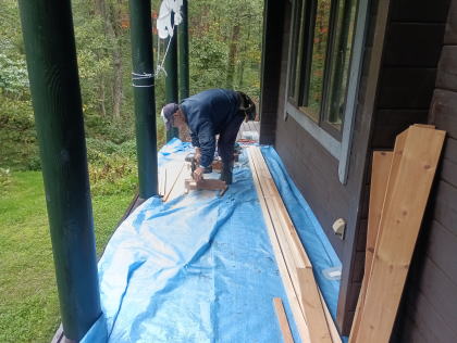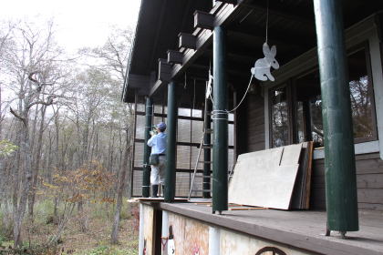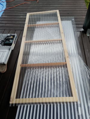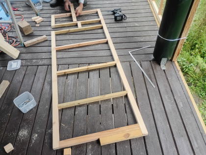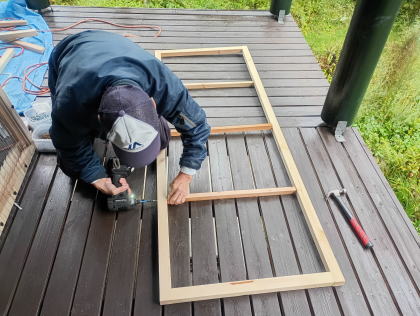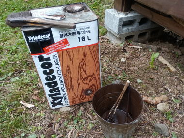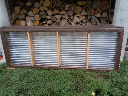 2025年10月半ば、紅葉の始まりを告げるツタウルシが美しい。 ![]() 秋は駆け足で進んでいくので、そろそろ冬の雪囲い準備もしなくてはならない。 ![]() 外は小雨が降っているが、彼はテラスに作業シートを広げて何か作業を始めた。 ![]() 「構想18年!!」 ![]() テラス上部は屋根受け梁があるので、その部分は避けて作る必要がある。 ![]() 作成したフレームには、ポリカの波板を張る。 ![]() 塗料は「キシラデコール」 ![]() 塗装によってフレームが歪むのを最小限にしたいので、塗るのは片面のみ。 |